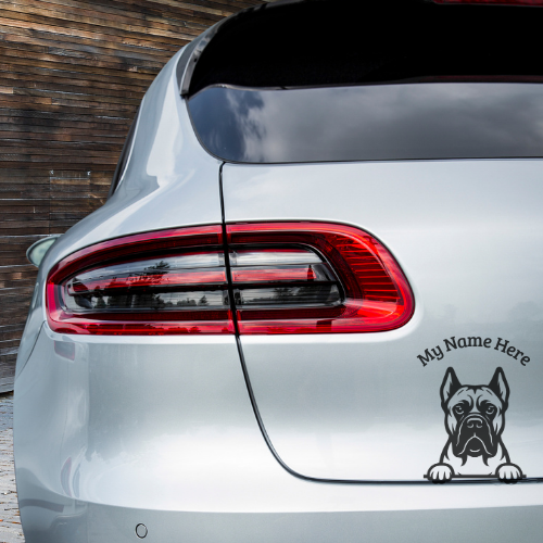This custom vinyl dog decal celebrates your bond with a clean, bold design that you can personalize with your dog’s name, favorite color, and size.
